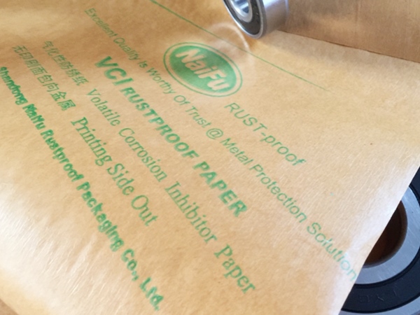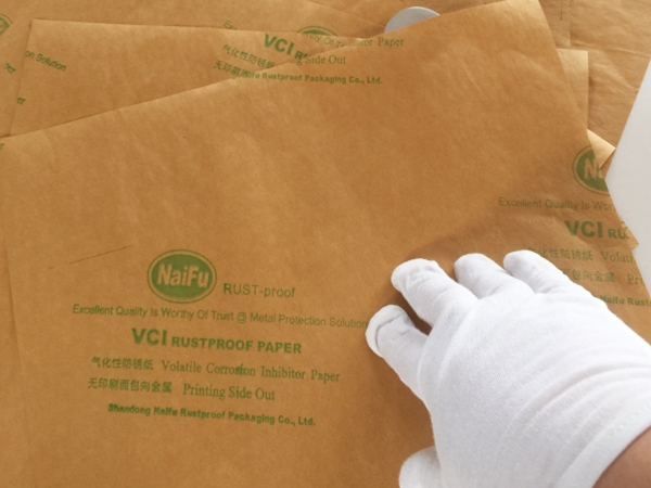4、包裝過程---將含有緩蝕劑的面朝向金屬包裝,不覆膜防銹紙可作為金屬產品間墊層隔材使用,以免其他材質阻隔材料含S、CL化學成分,影響防銹效果